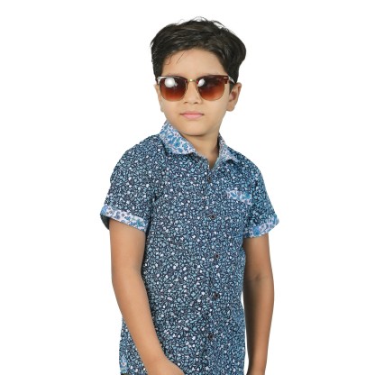 DARK NAVY BLUE ALL OVER PRINT BOYS' SHORT SLEEVE SHIRT CONTRAST COLLAR